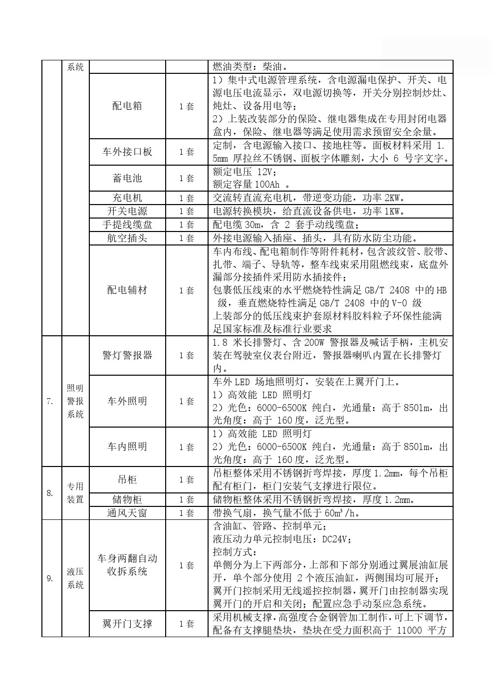 主要裝備有各類炊事設(shè)備,滿足50-300人用餐需求,由保溫廂體、炊事設(shè)備、灶具設(shè)施、水存儲(chǔ)、電氣控制系統(tǒng)、水路系統(tǒng)、油路系統(tǒng)以及就餐區(qū)等組成;擁有功能齊備的食品制作設(shè)備和相應(yīng)的操作空間,完全適用于野外炊事作業(yè)。